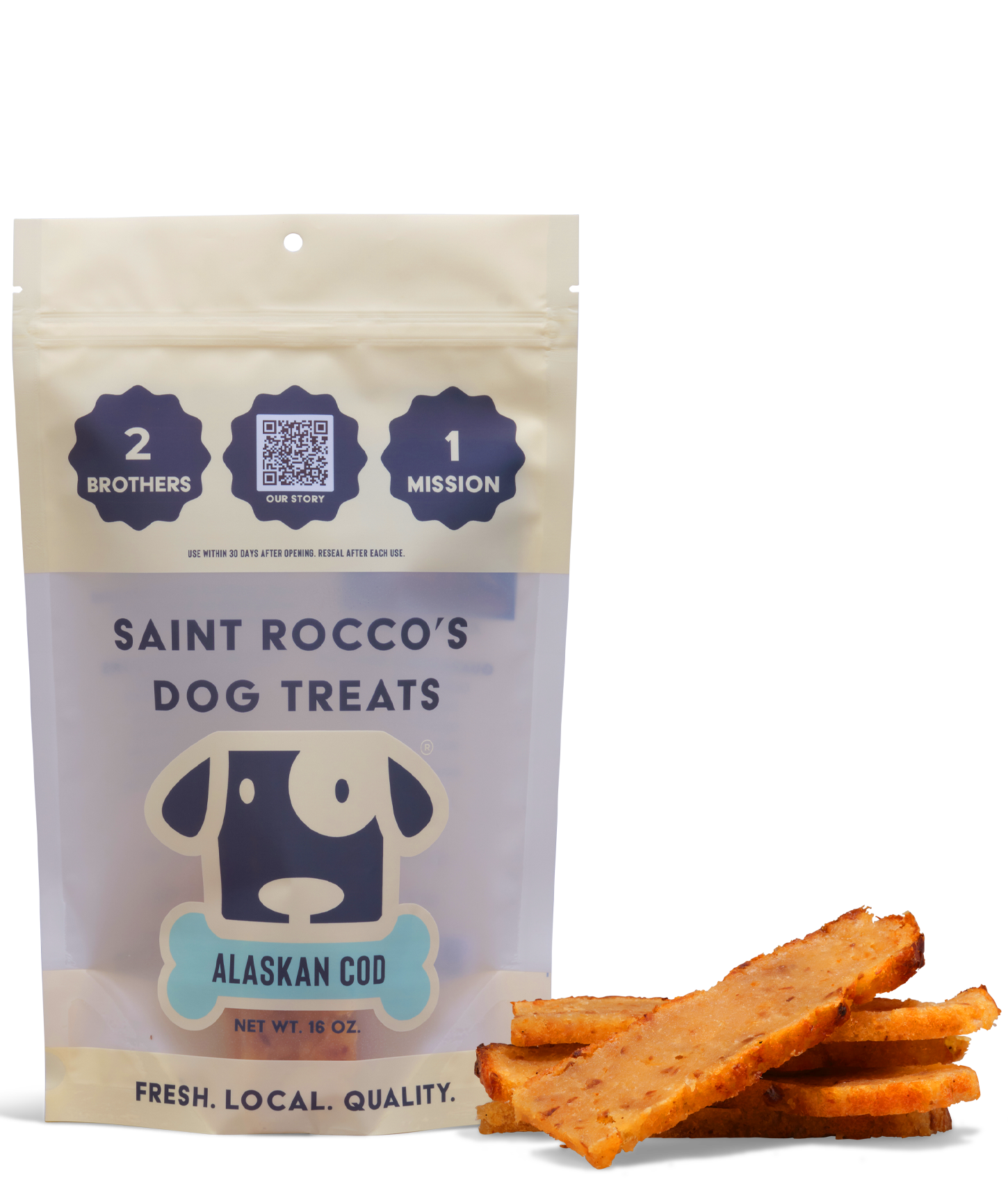 Hand-crafted using Wild-Caught Alaskan Cod. Our Cod treats are fresh-baked daily using our 48-hour artisan process. The result is a treat with unmatched flavor & aroma for your dog and a superior product experience for you, their human.