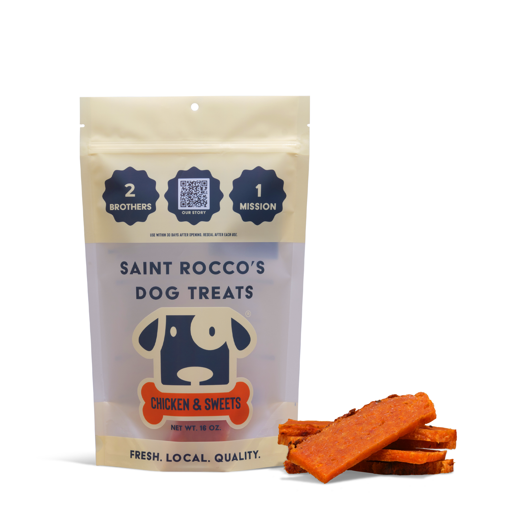 Hand-crafted using restaurant-grade chicken breasts & Sweet Potato. Our Chicken and Sweet treats are fresh-baked daily using our 48-hour artisan process. The result is a treat with unmatched flavor & aroma for your dog and a superior product experience for you, their human.