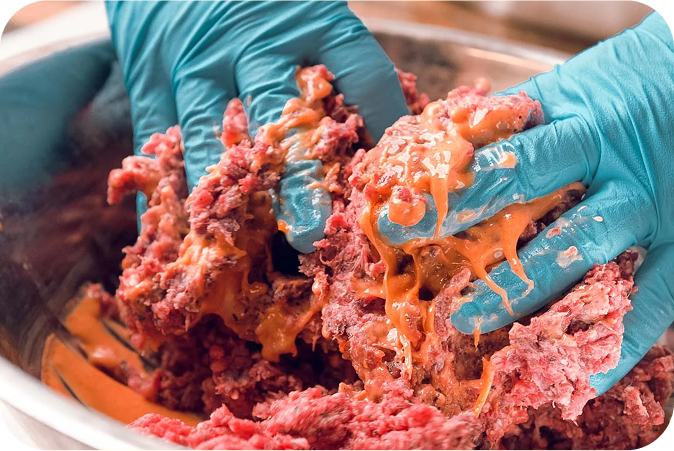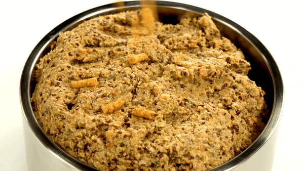 Our 7-Ingredient sprinkle recipes are mixed in small batches daily in Bucks County, PA. After mixing, we hand-press our sprinkle mix into meat loaves and oven-bake them. When our baking is complete, we deli-slice each loaf and air dry them for over 8 hours. Then, we grind them into pellet sized pieces and allow them another 4 hours of air drying time. This creates a meal topper aroma & texture that dogs crave!